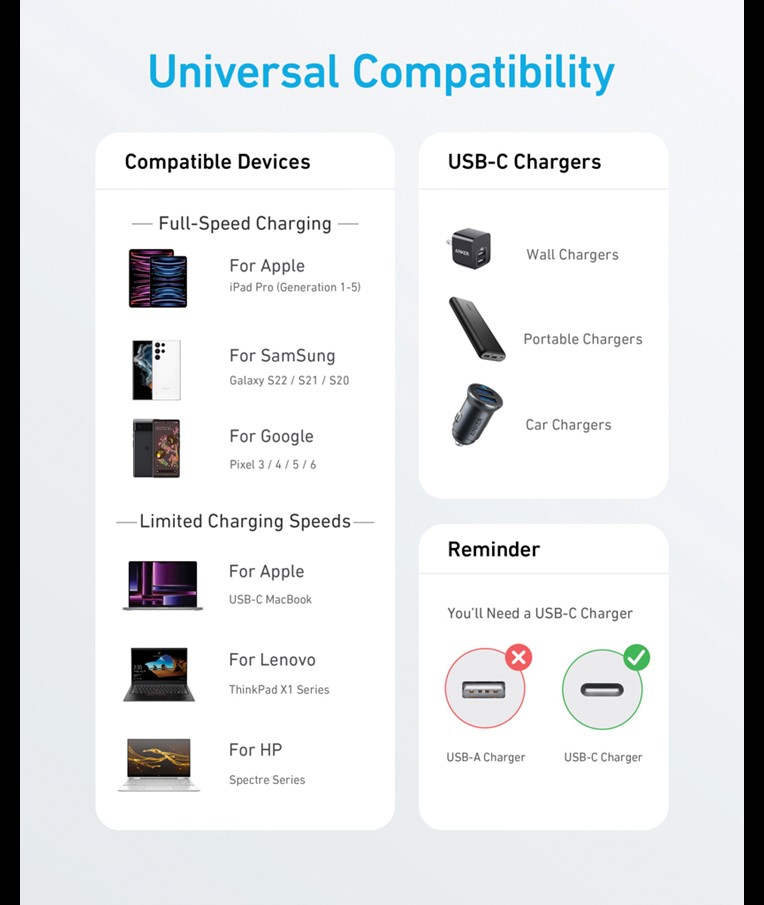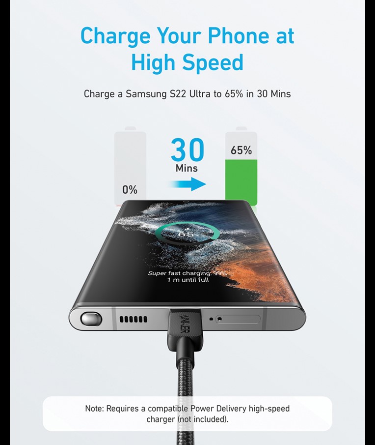 Kabel Anker 322 USB-C na USB-C (1,8 metra, 60 W, pleten) ponuja hitro in zanesljivo polnjenje ter prenos podatkov v trpežni zasnovi, ki se ne zapleta. Z močjo 60 W je idealen za hitro in varno polnjenje prenosnikov, tablic in pametnih telefonov. Pletena najlonska zunanjost doda dodatno trdnost in prožnost ter je odporna proti obrabi za dolgotrajno uporabo. Z dolžino 1,8 metra zagotavlja dovolj dolžine za priročno polnjenje kjer koli – idealen za dom, pisarno ali potovanja.