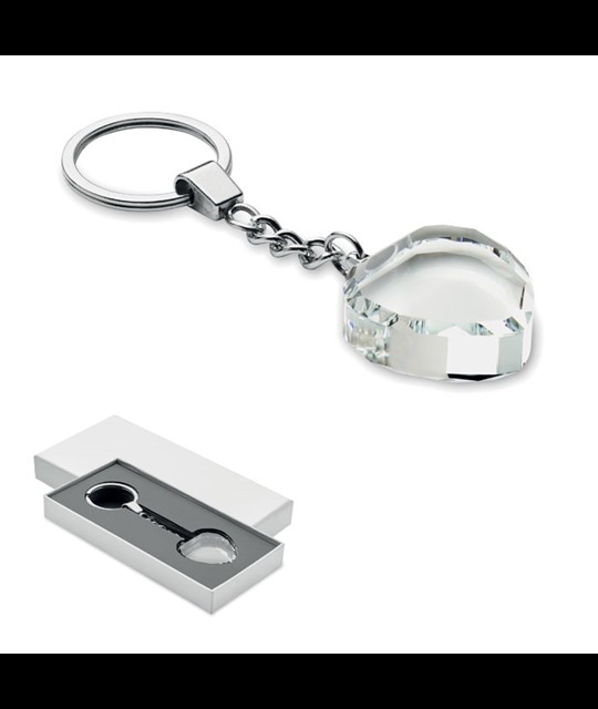 Kovinski obesek za ključe v mat biserni izvedbi z dekoracijo v obliki votlega srca s poliestrskim trakom, ki drži kovinski obroč. Posamezna darilna škatla.