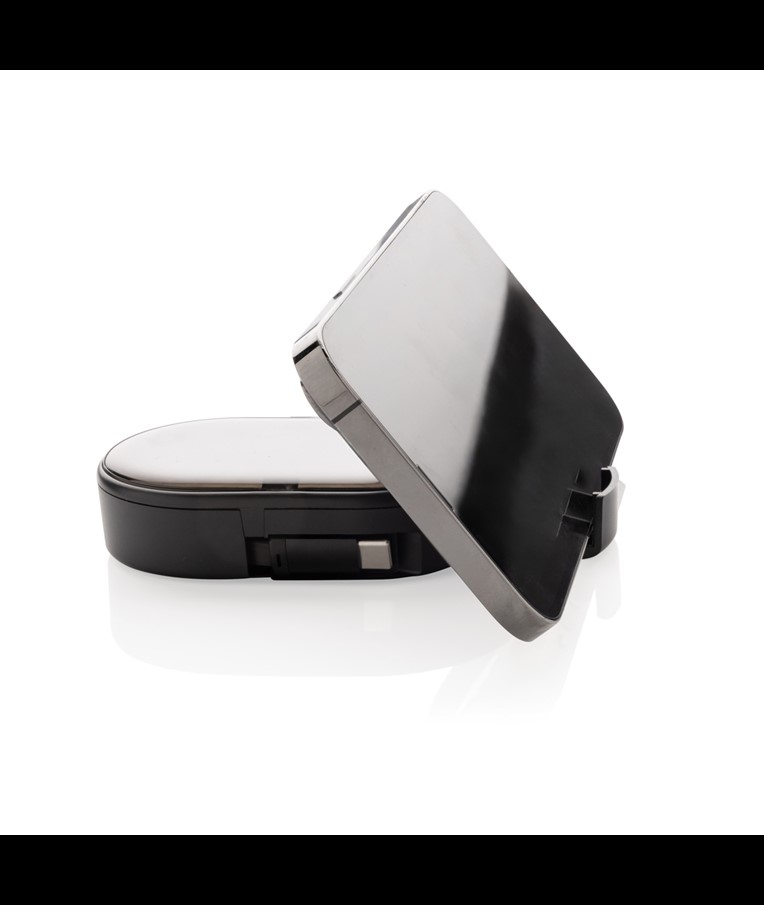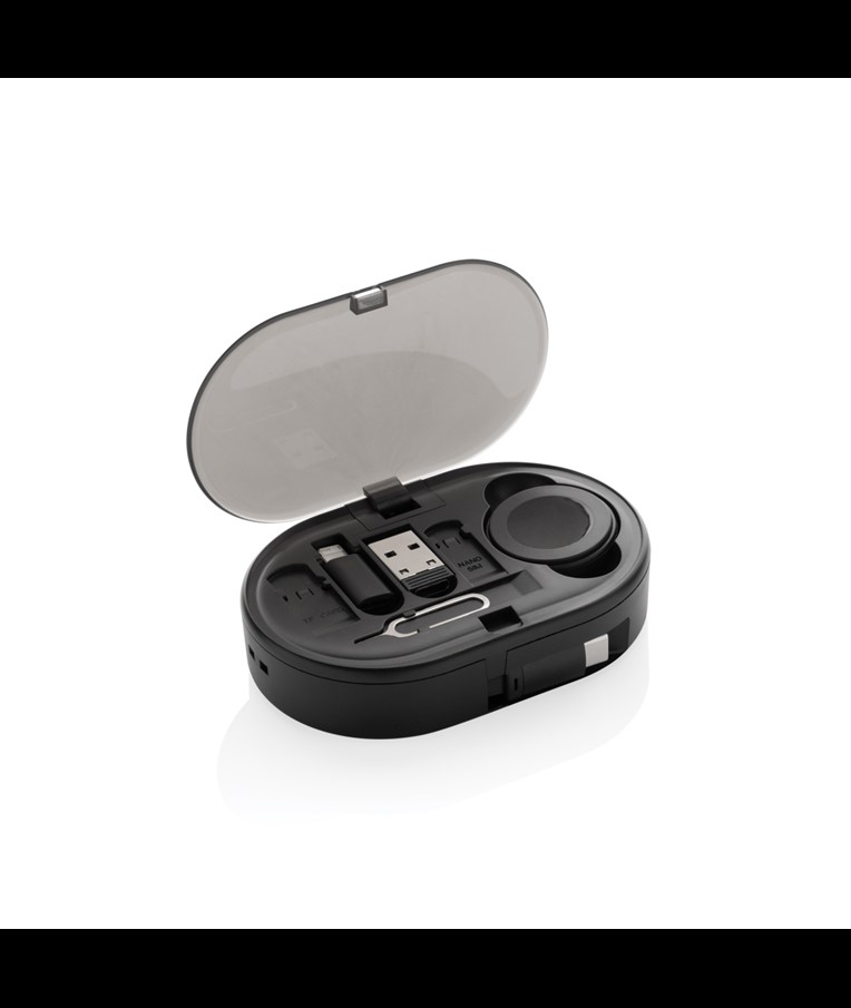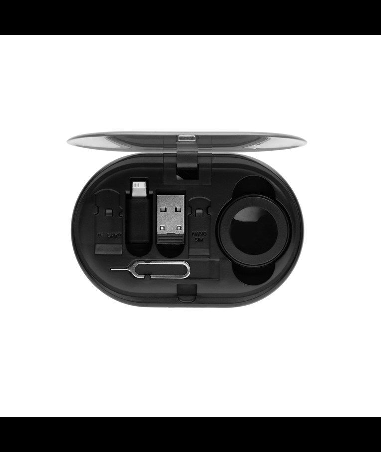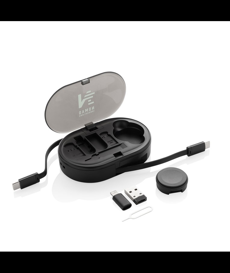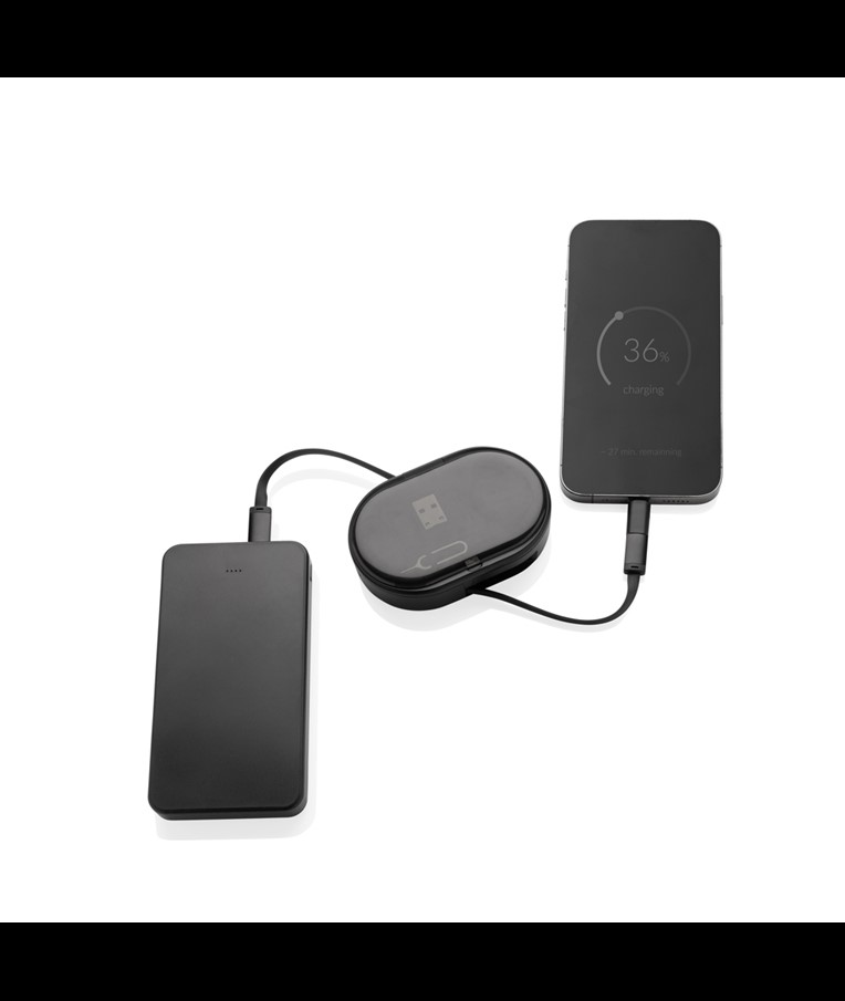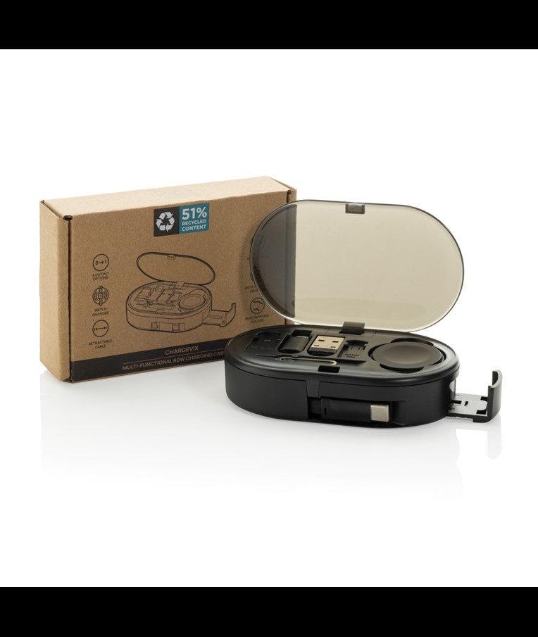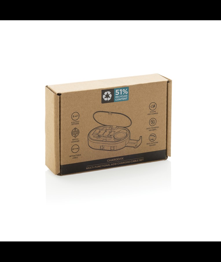 Komplet večnamenskih zložljivih polnilnih kablov Chargevix RCS ponuja vsestransko polnjenje in prenos podatkov za več naprav v kompaktni in organizirani zasnovi. Mat črno ohišje s prozornim pokrovom vsebuje 80 cm dolg zložljiv kabel in vključuje priključke za USB-C, USB-A, Micro in Lightning, ki podpirajo funkcije sinhronizacije podatkov ter CarPlay in Android Auto. Napajanje je optimizirano s 60 W prek USB-C na USB-C – primerno tudi za polnjenje prenosnikov – in 12 W za priključke USB-A na USB-C, USB-C na Lightning in USB-C na Micro. Dodatne funkcije vključujejo zatič za odstranitev kartice SIM, režo za pomnilniško kartico, režo za kartico SIM, držalo za telefon in polnilnik za Apple Watch. Izdelan je iz recikliranih materialov s certifikatom RCS. RCS (Recycled Claim Standard) je standard za preverjanje vsebnosti recikliranih izdelkov v celotni dobavni verigi. Skupna vsebnost recikliranih izdelkov: 51 % glede na skupno težo izdelka. Izdelek in dodatki ne vsebujejo PVC-ja in so pakirani v embalaži FSC®.