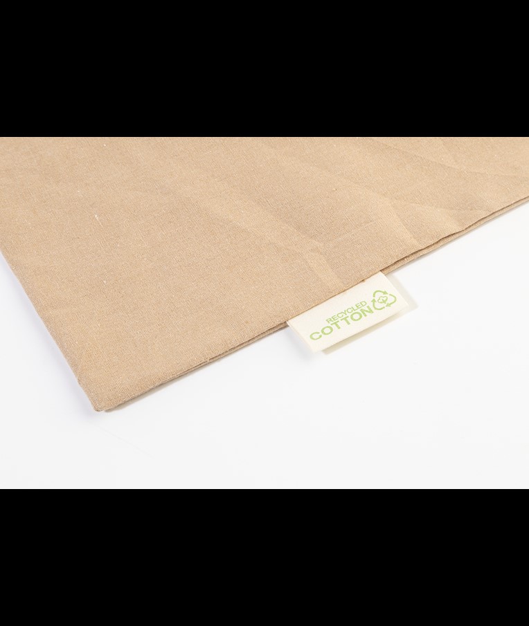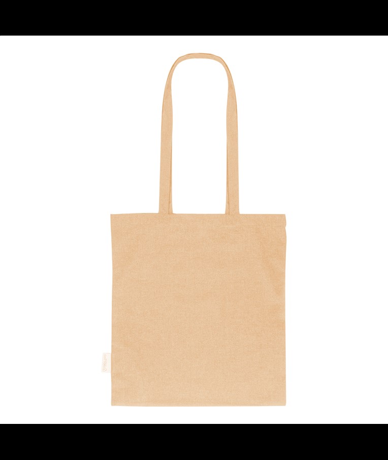 Nakupovalna torba z dolgimi ročaji iz 70 % recikliranega bombaža in 30 % RPET poliestra, 140 g/m². Z značilno etiketo iz recikliranega bombaža.