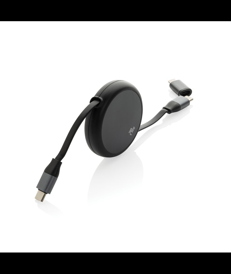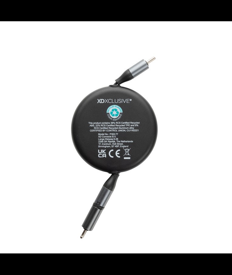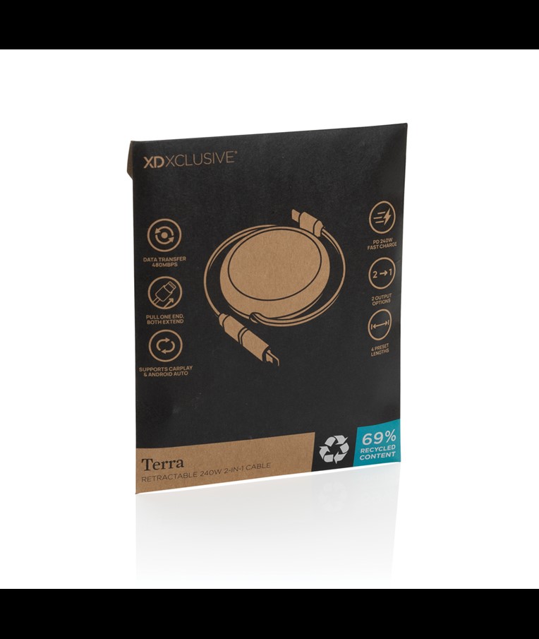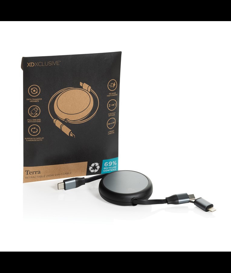 Terra RCS zložljivi polnilni kabel iz recikliranega aluminija z močjo 240 W. Terra je visokozmogljiv zložljivi polnilni kabel, zasnovan za ultra hitro polnjenje in maksimalno udobje. Z vhodom USB-C in dvojnim izhodom (USB-C in iOS) napaja vse od telefonov do prenosnikov z bliskovito hitrostjo – do 240 W. Pametni zložljivi mehanizem se razteza samo z ene strani in gladko prilagaja štirim prednastavljenim dolžinam za enostavno uporabo v vseh okoljih. Terra podpira tudi sinhronizacijo podatkov s hitrostjo 480 Mbps in je združljiv s CarPlay in Android Auto, kar ponuja polno funkcionalnost v enem kompaktnem kablu. Izdelan je iz recikliranih materialov s certifikatom RCS, vključno z recikliranim aluminijem, ABS, TPE in kositrom. RCS (standard za trditev o recikliranju) je standard za preverjanje vsebnosti recikliranih izdelkov v celotni dobavni verigi. Skupna vsebnost recikliranih izdelkov: 69 % glede na skupno težo izdelka. Brez PVC-ja in pakirano v embalaži FSC®.
